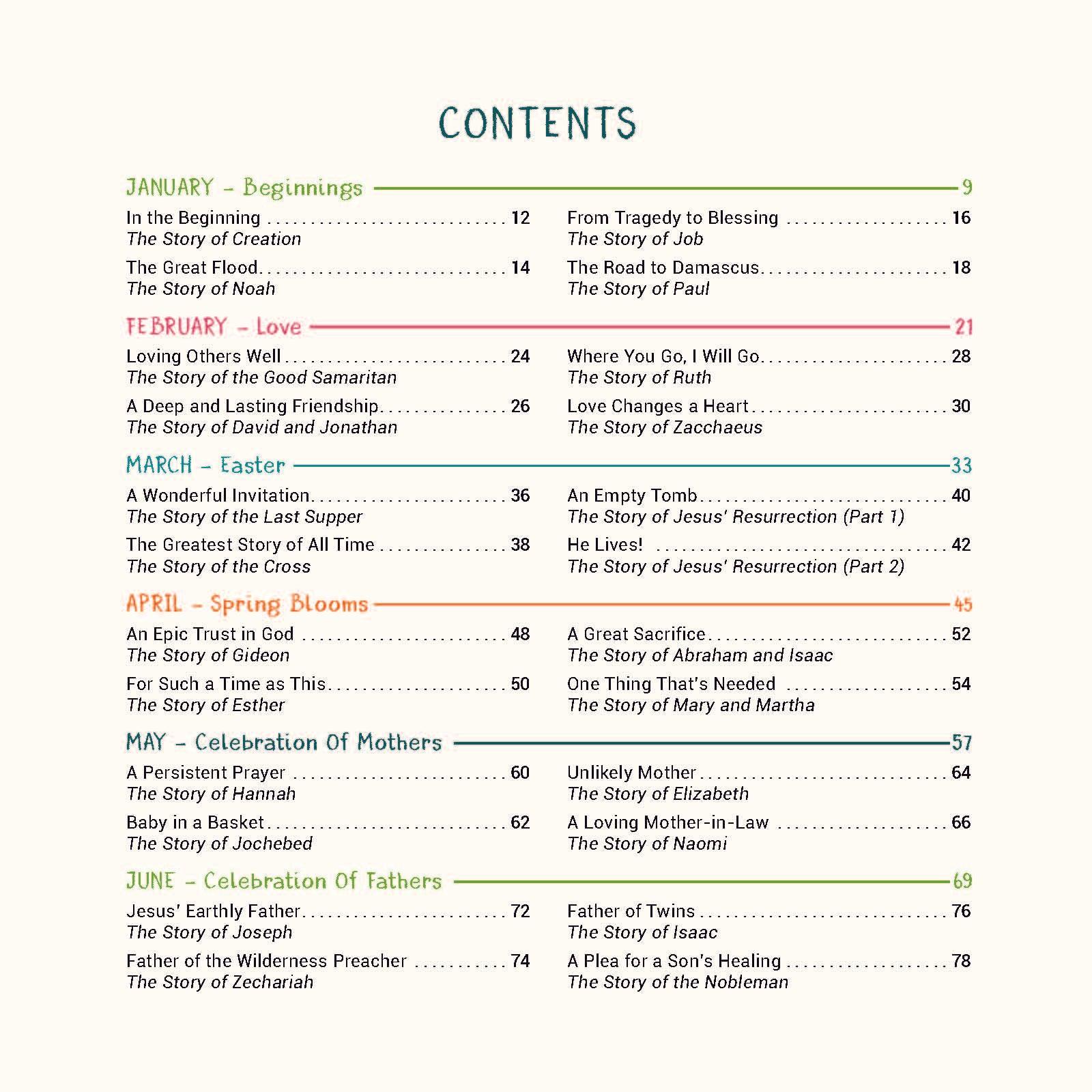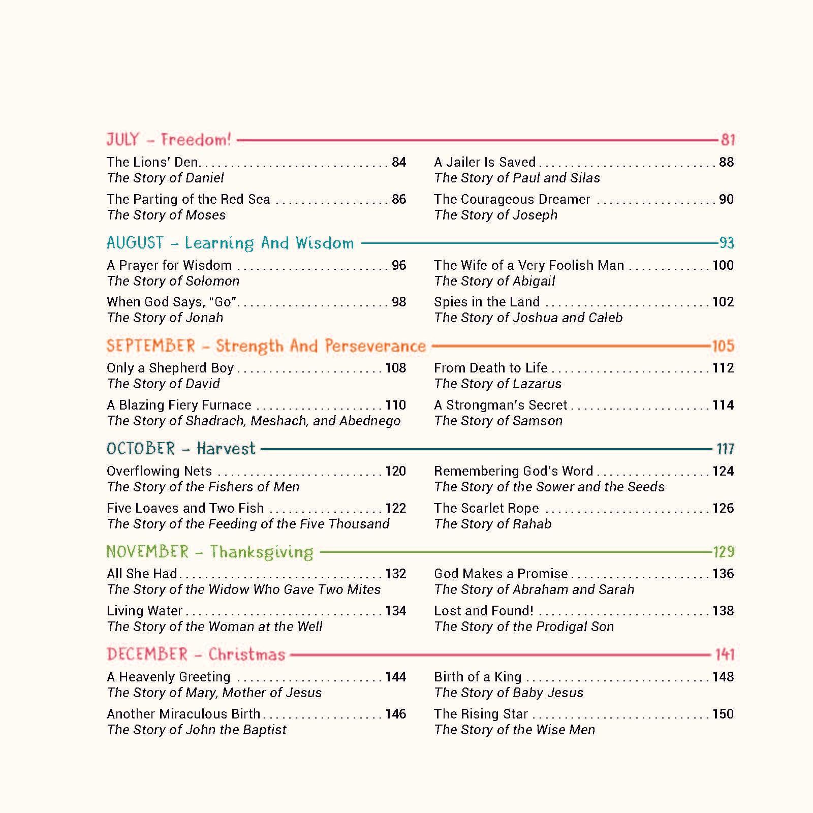 The stories are arranged into monthly themes that relate to a specific month of the calendar year: