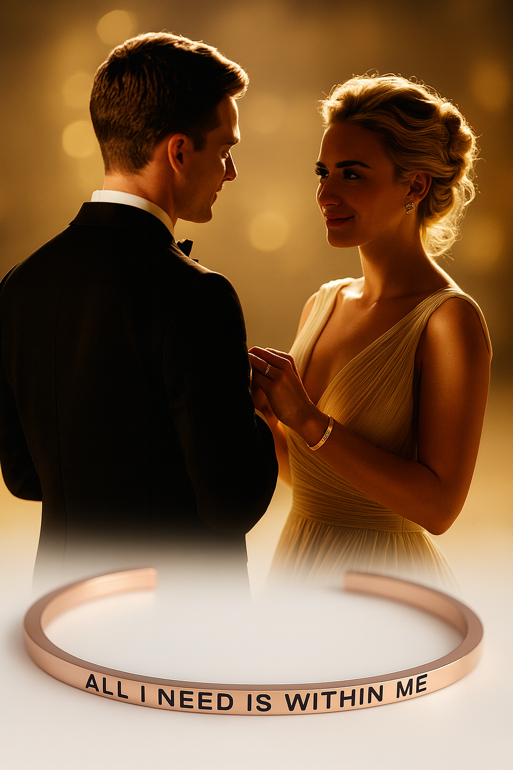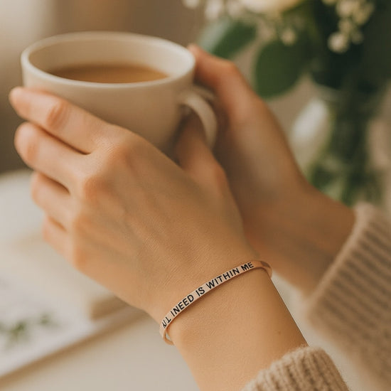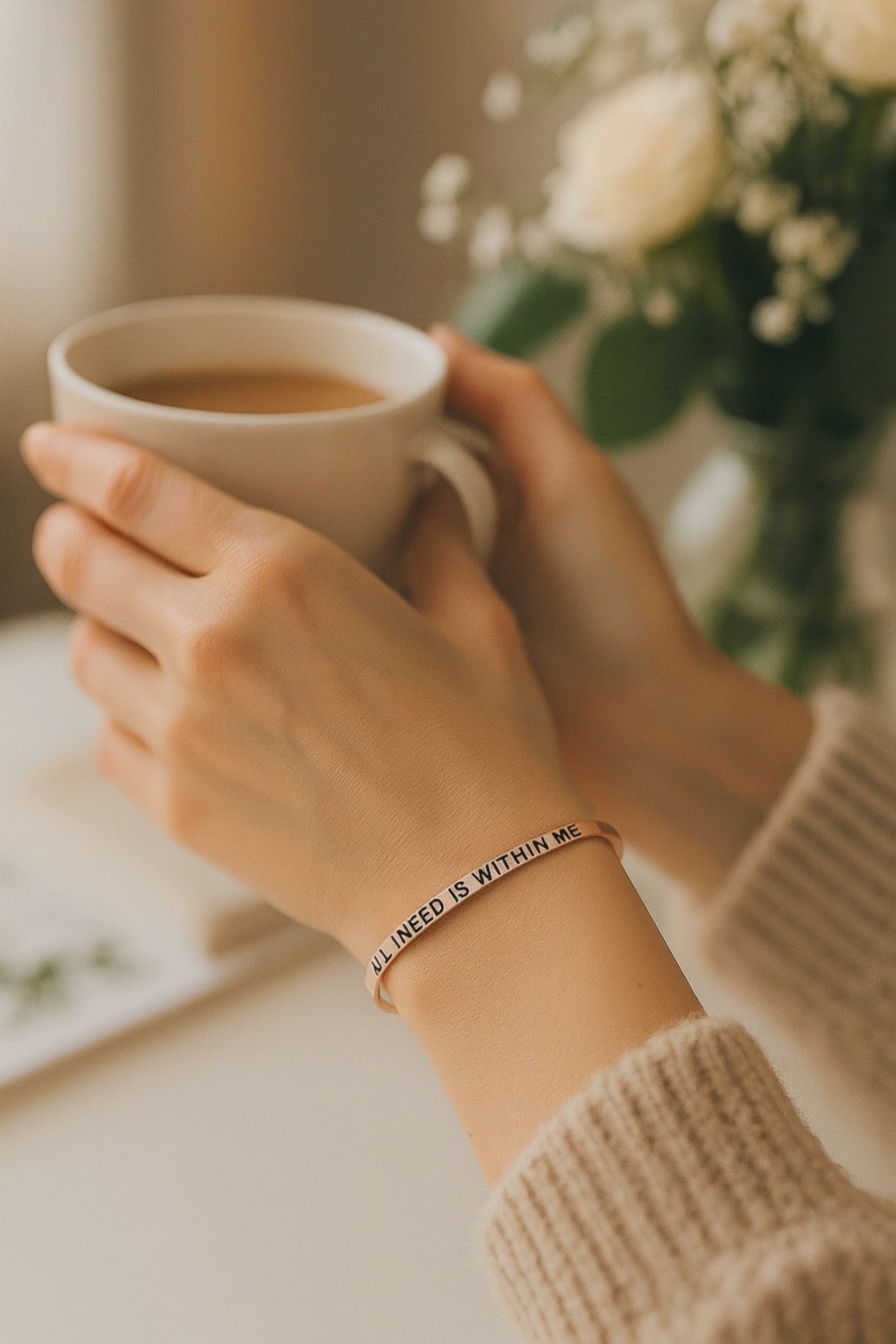 This bracelet carries the message: ALL I NEED IS WITHIN ME. You see it in the moments that matter — reaching for your phone, your keys, your coffee mug.