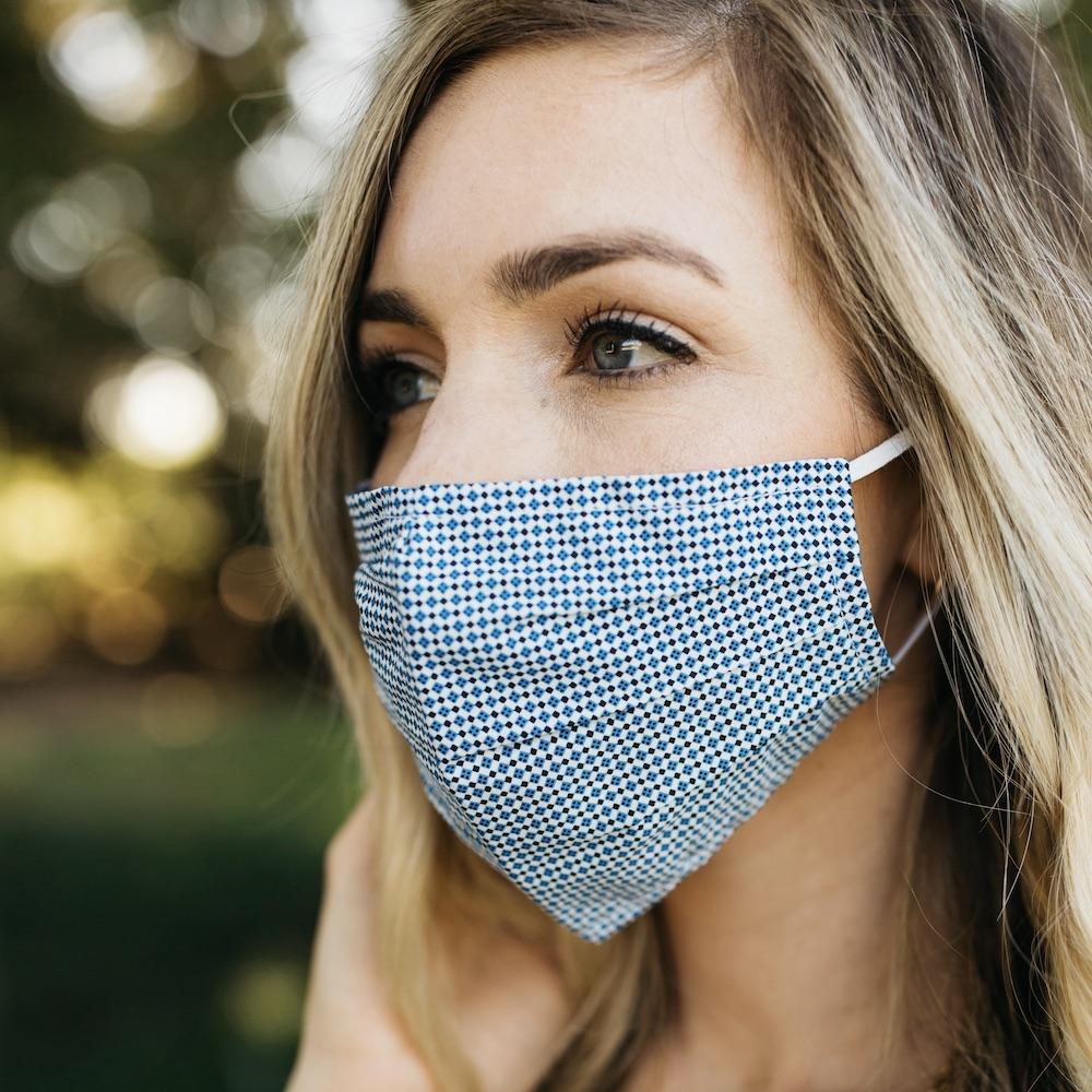 These washable, reusable, 95% cotton 5% spandex face masks are made of high quality, breathable, double-layered cotton for a slight stretch with fine, detailed stitching. Elastic straps for ears are made from a blended material that may include latex.